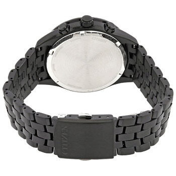 Black stainless steel case and bracelet. Fixed black stainless steel bezel. Black dial with silver-tone hands and index hour markers. Tachymeter scale around the outer rim. Dial Type: Analog. Date display at the 4 o'clock position. Chronograph - three sub-dials displaying: 24 hours, 60 minutes, 60 seconds. Citizen Caliber Eco-Drive H504 eco-drive movement with a 5 months power reserve. Scratch resistant sapphire crystal. Solid case back. Round case shape, case size: 48.5 mm. Fold over clasp with a safety release. Water resistant at 100 meters / 330 feet. Functions: chronograph, date, hour, minute, second. Sport watch style. Watch label: Japan Movt. Citizen Eco-Drive Chronograph Black Dial Men's Watch AT2145-86E.