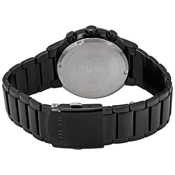 Black ion-plated stainless steel case with a black ion-plated stainless steel bracelet. Fixed black ion-plated stainless steel bezel. Black dial with silver-tone hands and index hour markers. Minute markers around the outer rim. Dial Type: Analog. Date display at the 4 o'clock position. Chronograph - three sub-dials displaying: 24 hour, 60 minute, 60 second. Citizen Caliber Eco-Drive H500 eco-drive movement. Scratch resistant sapphire crystal. Pull / push crown. Solid case back. Round case shape, case size: 41 mm, case thickness: 10.01 mm. Band width: 21.7. Fold over with safety release clasp. Water resistant at 100 meters / 330 feet. Functions: chronograph, date, GMT, second time zone, hour, minute, second, solar-powered. Casual watch style. Watch label: Japan Movt. Citizen Eco-Drive Chronograph Black Dial Men's Watch AT2405-87E.