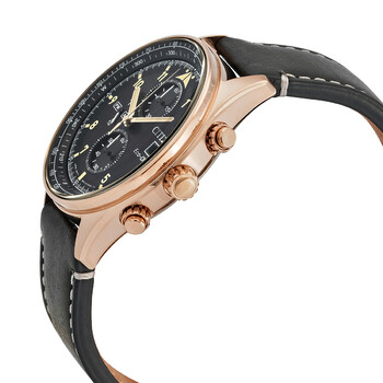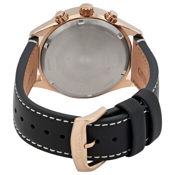 Rose gold IP stainless steel case with a black leather strap. Fixed rose gold IP stainless steel bezel. Black dial with rose gold IP hands and index-Arabic numeral hour markers. Minute markers around the outer rim. Tachymeter scale. Dial Type: Analog. Luminescent hands and markers. Date display at the 3 o'clock position. Chronograph - three sub-dials displaying: 60 second, 60 minute and 24 hour. Citizen Caliber Eco-Drive B612 eco-drive movement. Scratch resistant mineral crystal. Solid case back. Round case shape, case size: 43 mm, case thickness: 12.5 mm. Tang clasp. Water resistant at 100 meters / 330 feet. Functions: chronograph, date, hour, minute, second, solar-powered. Sport watch style. Watch label: Japan Movt. Citizen Eco-Drive Chronograph Black Dial Men's Watch CA0773-15E.