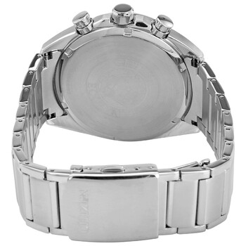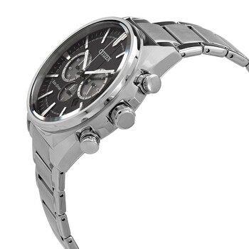 Stainless steel case with a stainless steel bracelet. Fixed stainless steel bezel. Black dial with luminous silver-tone hands and index hour markers. Minute markers around the outer rim. Dial Type: Analog. Luminescent hands and markers. Date display between the 4 and 5 o'clock positions. Chronograph - three sub-dials displaying: 60 second, 60 minute and 24 hour. Citizen caliber B620 eco-drive movement. Scratch resistant mineral crystal. Pull / push crown. Solid case back. Round case shape. Case size: 42.9 mm. Case thickness: 12 mm. Band width: 20 mm. Fold over clasp with a push button release. Water resistant at 100 meters / 330 feet. Functions: chronograph, date, hour, minute, second. Sport watch style. Watch label: Japan Movt. Citizen Eco-Drive Chronograph Black Dial Men's Watch CA4280-53E.
