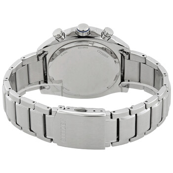 Silver-tone stainless steel case and bracelet. Fixed silver-tone stainless steel bezel. Black dial with silver-tone;grey hands and index hour markers. Minute markers around the inner rim. Tachymeter around the outer rim. Dial Type: Analog. Date display between 4 and 5 o'clock position. Chronograph - three sub-dials displaying: 60 second, 60 minute and 24 hour. Citizen Caliber Eco-Drive B620 eco-drive movement. Scratch resistant mineral crystal. Solid case back. Round case shape, case size: 44.8 mm, case thickness: 12.3 mm. Deployment with push button release clasp. Water resistant at 100 meters / 330 feet. Functions: chronograph, date, hour, minute, second. Sport watch style. Watch label: Japan Movt. Citizen Eco-Drive Chronograph Black Dial Men's Watch CA4560-81E.