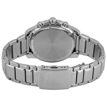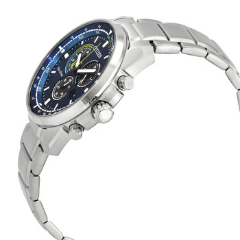 Silver-tone stainless steel case and bracelet. Fixed silver-tone stainless steel bezel. Blue dial with black hands and index hour markers. Minute markers around the outer rim. Dial Type: Analog. Date display at the 4 o'clock position. Chronograph - three sub-dials displaying: 60 second, 30 minute and 24 hour. Caliber H570 eco-drive movement with a 150-day power reserve. Scratch resistant mineral crystal. Solid case back. Round case shape, case size: 42 mm, case thickness: 11 mm. Band width: 22 mm. Fold over clasp with a safety release. Water resistant at 100 meters / 330 feet. Functions: chronograph, hour, minute, second. Sport watch style. Watch label: Japan Movt. Citizen Eco-Drive Chronograph Blue Dial Men's Watch AT1190-87L.
