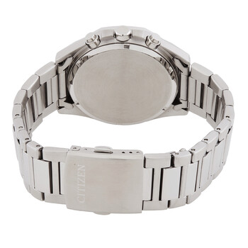 Silver-tone stainless steel case and bracelet. Fixed silver-tone stainless steel bezel. Blue dial with silver-tone hands and index hour markers. Minute markers around the outer rim. Dial Type: Analog. Date display between 4 and 5 o'clock position. Chronograph - three sub-dials displaying: 60 second, 60 minute and 24 hour. Citizen Caliber Eco-Drive B620 eco-drive movement. Scratch resistant mineral crystal. Solid case back. Octogonal case shape, case size: 41 mm. Band width: 22 mm. Fold over clasp with a safety release. Water resistant at 100 meters / 330 feet. Functions: chronograph, date, hour, minute, second, solar-powered. Sport watch style. Watch label: Japan Movt. Citizen Eco-Drive Chronograph Blue Dial Men's Watch CA4590-81L.