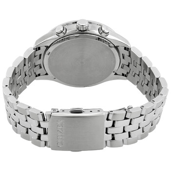 Silver-tone stainless steel case and bracelet. Fixed silver-tone stainless steel bezel. Green dial with silver-tone hands and index hour markers. Minute markers around the inner rim. Tachymeter around the outer rim. Dial Type: Analog. Date display between 4 and 5 o'clock position. Chronograph - three sub-dials displaying: 60 second, 60 minute and 24 hour. Citizen Caliber Eco-Drive H504 eco-drive movement. Scratch resistant sapphire crystal. Solid case back. Round case shape, case size: 42 mm, case thickness: 10.5 mm. Deployment with push button release clasp. Water resistant at 100 meters / 330 feet. Functions: chronograph, date,hour, minute, second, solar-powered. Sport watch style. Watch label: Japan Movt. Citizen Eco-Drive Chronograph Green Dial Men's Watch AT2149-85X.