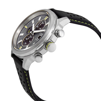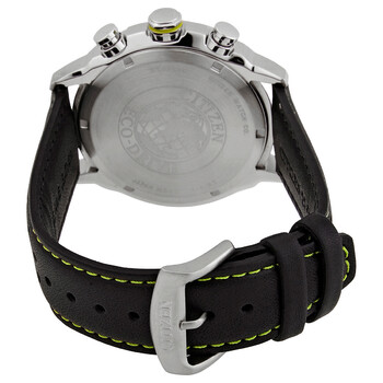 Stainless steel case with a black leather strap. Fixed stainless steel bezel. Grey dial with luminous silver-tone hands and index hour markers. Minute markers around the outer rim. Dial Type: Analog. Luminescent hands and markers. Date display at the 3 o'clock position. Chronograph - three sub-dials displaying: 60 second, 60 minute and 24 hour. Citizen caliber Eco-Drive B612 eco-drive movement. Scratch resistant mineral crystal. Solid case back. Round case shape. Case size: 43 mm. Case thickness: 12 mm. Band width: 22 mm. Tang clasp. Water resistant at 100 meters / 330 feet. Functions: chronograph, date, hour, minute, second. Casual watch style. Citizen Eco-Drive Chronograph Grey Dial Men's Watch CA0739-13H.