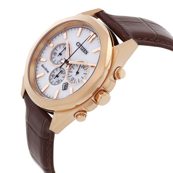 Gold-tone stainless steel case with a brown leather strap. Fixed gold-tone stainless steel bezel. Ivory white dial with gold-tone hands and index hour markers. Minute markers around the outer rim. Dial Type: Analog. Date display between 4 and 5 o'clock position. Chronograph - three sub-dials displaying: 60 second, 60 minute and 24 hour. Citizen Caliber Eco-Drive B620 eco-drive movement. Scratch resistant mineral crystal. Solid case back. Octogonal case shape, case size: 41 mm. Band width: 22 mm. Tang clasp. Water resistant at 100 meters / 330 feet. Functions: chronograph, date, hour, minute, second, solar-powered. Sport watch style. Watch label: Japan Movt. Citizen Eco-Drive Chronograph Ivory White Dial Men's Watch CA4593-15A.