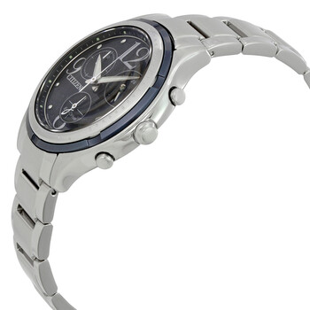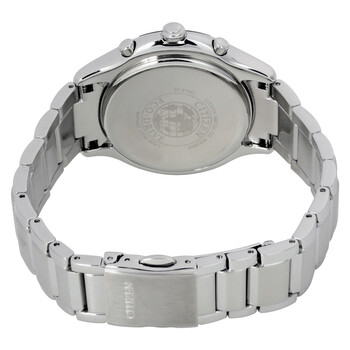 Stainless steel case with a stainless steel bracelet. Fixed bezel. Black dial with luminous silver-tone hands and dot hour markers. Arabic numerals mark the 3, 6, 9 and 12 o'clock positions. Minute markers around the outer rim. Dial Type: Analog. Luminescent hands. Date display at the 4 o'clock position. Chronograph - three sub-dials displaying: 60 second, 60 minute and 24 hours. Citizen caliber H504 quartz movement. Scratch resistant sapphire crystal. Pull / push crown. Solid case back. Case size: 40 mm. Case thickness: 10 mm. Round case shape. Band width: 20 mm. Deployment clasp with a push button release. Water resistant at 50 meters / 165 feet. Functions: chronograph, date, hour, minute, second. Sport watch style. Watch label: Japan Movt. Citizen Eco-Drive Chronograph Ladies Watch FB1376-54E.