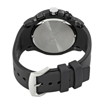 Black ion-plated stainless steel case with a black rubber strap. Fixed black ion-plated bezel with a red top ring. Black dial with luminous black hands and index / Arabic numeral hour markers. Minute markers around the outer rim. Dial Type: Analog. Luminescent hands and markers. Date display at the 4 o'clock position. Chronograph - three sub-dials displaying: 60 second, 60 minute and 24 hour. Citizen caliber E8637 quartz movement. Scratch resistant mineral crystal. Pull / push crown. Solid case back. Case size: 42 mm. Case thickness: 11 mm. Round case shape. Band width: 20 mm. Band length: 8.5 inches. Tang clasp. Water resistant at 30 meters / 100 feet. Functions: chronograph, date, hour, minute, second. Sport watch style. Citizen Eco-Drive Chronograph Men's Watch AT0709-08E.