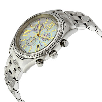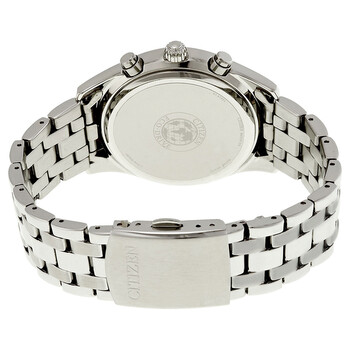 Stainless steel case with a stainless steel bracelet. Fixed stainless steel bezel. Mother of pearl dial with gold-tone hands and alternating index and Roman numeral hour markers. Minute markers around the outer rim. Dial Type: Analog. Luminescent hands. Date display at the 4 o'clock position. Two sub-dials displaying: 60 minute and 24 hour. Eco-drive movement. Scratch resistant mineral crystal. Screw down crown. Solid case back. Case diameter: 40 mm. Case thickness: 9 mm. Round case shape. Band width: 20 mm. Fold over with safety clasp. Water resistant at 30 meters / 100 feet. Functions: chronograph, date, hour, minute, second. Watch label: Japan Movt. Item Variations: FB1360 54D, FB1360.54D, FB136054D. Citizen Eco-Drive Chronograph Mother of Pearl Ladies Watch FB1360-54D