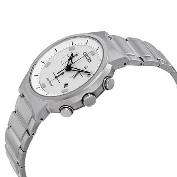 Stainless steel case with a stainless steel bracelet. Fixed stainless steel bezel. White dial with black skeleton hands and index hour markers. Minute markers around the outer rim. Dial Type: Analog. Date display at the 4 o'clock position. Chronograph - three sub-dials displaying: 60 minute, 60 second and 24 hour. Citizen caliber Eco-Drive H500 eco-drive movement. Scratch resistant sapphire crystal. Pull / push crown. Solid case back. Round case shape. Case size: 41 mm. Case thickness: 10.1 mm. Band width: 21.5 mm. Fold over clasp with a push button release. Water resistant at 100 meters / 330 feet. Functions: chronograph, date, GMT, second time zone, hour, minute, second, solar-powered. Eco-drive Series. Casual watch style. Watch label: Japan Movt. Citizen Eco-Drive Chronograph White Dial Men's Watch AT2400-81A.