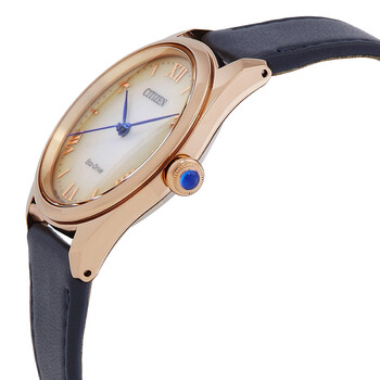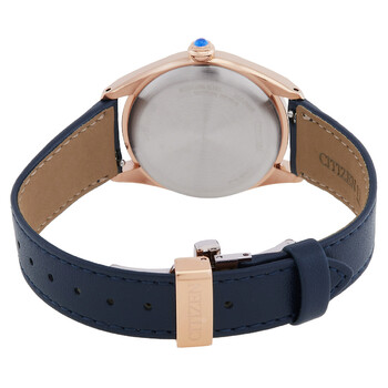 Rose gold-tone stainless steel case with a blue leather strap. Fixed rose gold-tone stainless steel bezel. Blue hands and index-Roman numeral hour markers. Minute markers around the outer rim. Dial Type: Analog. Citizen Caliber Eco-Drive E031 eco-drive movement. Scratch resistant sapphire crystal. Solid case back. Round case shape, case size: 33, case thickness: 8.7. Functions: hour, minute, second, solar-powered. Citizen L Series. Watch label: Japan Movt. Citizen Eco-Drive Citizen L Ladies Watch EM1143-14Z.