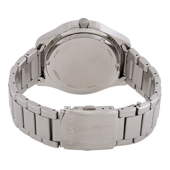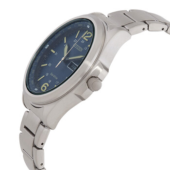 Silver-tone stainless steel case and bracelet. Fixed silver-tone stainless steel bezel. Blue dial with black hands and index-Arabic numeral hour markers. Minute markers around the outer rim. Dial Type: Analog. Luminescent hands and markers. Day of the week and date display at the 3 o'clock position. Citizen Caliber Eco-Drive J800 eco-drive movement. Scratch resistant mineral crystal. Solid case back. Round case shape, case size: 44 mm. Fold over clasp with a safety release. Water resistant at 100 meters / 330 feet. Functions: date, day, hour, minute, second, solar-powered. Dress watch style. Watch label: Japan Movt. Citizen Blue Dial Men's Watch AW0110-58L.