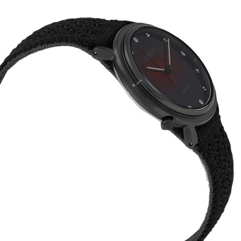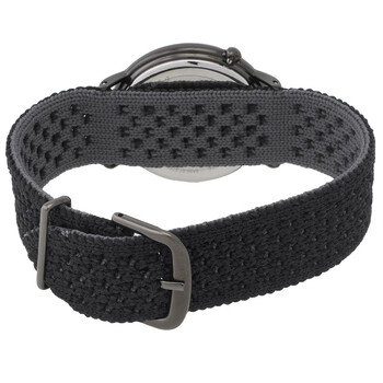 Grey stainless steel case with a black polyester knit band. Fixed grey stainless steel bezel. Black dial with black hands and dots-crystal hour markers. Dial Type: Analog. Citizen Caliber Eco-Drive E031 eco-drive movement. Scratch resistant sapphire crystal. Pull / push crown. Solid case back. Round case shape, case size: 34 mm, case thickness: 7.1 mm. Tang clasp. Water resistant at 50 meters / 165 feet. Functions: hour, minute, second, solar-powered. Dress watch style. Watch label: Japan Movt. Citizen Eco-Drive Crystal Black Dial Ladies Watch EM1007-47E.