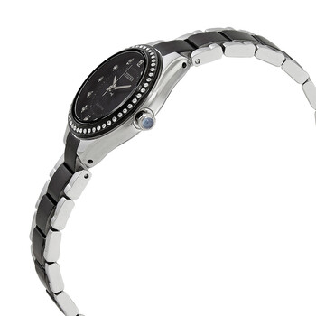Stainless steel case with a two-tone (silver-tone and black-plated) stainless steel bracelet. Fixed black-plated bezel set with crystals. Black dial with silver-tone hands and crystal hour markers. Minute markers around an inner ring. Dial Type: Analog. Date display at the 3 o'clock position. Citizen Caliber E011 eco-drive movement. Scratch resistant sapphire crystal. Pull / push crown. Solid case back. Round case shape. Case size: 26 mm. Case thickness: 7.4 mm. Band width: 12 mm. Fold over clasp with a push button release. Water resistant at 50 meters / 165 feet. Functions: date, hour, minute, second. Dress watch style. Watch label: Japan Movt. Citizen Eco-Drive Crystal Black Dial Ladies Watch EW2558-88E.