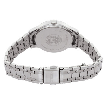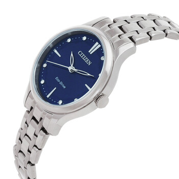 Silver-tone stainless steel case and bracelet. Fixed silver-tone stainless steel bezel. Blue dial with silver-tone hands and crystal-index hour markers. Minute markers around the outer rim. Dial Type: Analog. Citizen Caliber Eco-Drive E031 eco-drive movement. Scratch resistant mineral crystal. Pull / push crown. Solid case back. Round case shape, case size: 30.5 mm. Deployment with push button release clasp. Water resistant at 50 meters / 165 feet. Functions: hour, minute, second, solar-powered. Dress watch style. Watch label: Japan Movt. Citizen Eco-Drive Crystal Blue Dial Ladies Watch EM0890-85L.