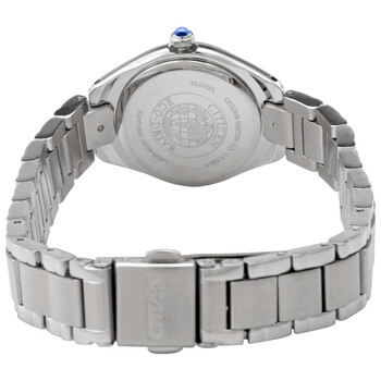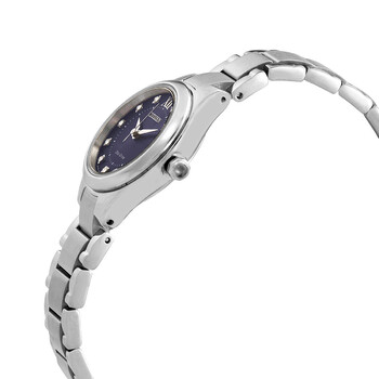 Stainless steel case with a stainless steel bracelet. Fixed stainless steel bezel. Blue dial with silver-tone hands and Swarovski crystal hour markers. Roman numeral appears at the 12 o'clock position. Minute markers around an inner ring. Dial Type: Analog. Luminescent hands. Date display at the 3 o'clock position. Citizen caliber E011 eco-drive movement. Scratch resistant sapphire crystal. Pull / push crown. Solid case back. Round case shape. Case size: 30.8 mm. Case thickness: 7.4 mm. Band width: 12 mm. Fold over clasp with a safety release. Water resistant at 50 meters / 165 feet. Functions: date, hour, minute, second. Eco-drive Series. Dress watch style. Watch label: Japan Movt. Citizen Eco-Drive Crystal Blue Dial Stainless Steel Ladies Watch EW2540-83L.
