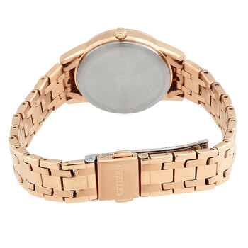 Rose gold-tone stainless steel case and bracelet. Fixed rose gold-tone stainless steel bezel. Silver dial with rose gold-tone hands and Roman numeral-crystal hour markers. Dial Type: Analog. Date display at the 3 o'clock position. Citizen Caliber Eco-Drive J710 eco-drive movement. Scratch resistant mineral crystal. Pull / push crown. Solid case back. Round case shape, case size: 29 mm. Band width: 14 mm. Deployment with push button release clasp. Water resistant at 30 meters / 100 feet. Functions: date, hour, minute, second, solar-powered. Dress watch style. Watch label: Japan Movt. Citizen Eco-Drive Crystal Silver Dial Ladies Watch FE1243-83A.