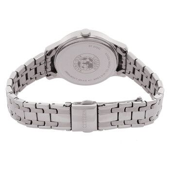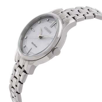 Silver-tone stainless steel case and bracelet. Fixed silver-tone stainless steel bezel. White dial with silver-tone hands and crystal-index hour markers. Dial Type: Analog. Citizen Caliber Eco-Drive E031 eco-drive movement. Scratch resistant mineral crystal. Pull / push crown. Solid case back. Round case shape, case size: 30.5 mm. Deployment with push button release clasp. Water resistant at 50 meters / 165 feet. Functions: hour, minute, second. Dress watch style. Watch label: Japan Movt. Citizen Eco-Drive Crystal White Dial Ladies Watch EM0890-85A.
