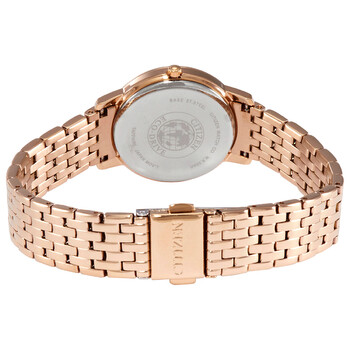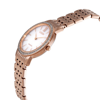 Rose gold-tone stainless steel case and bracelet. Fixed bezel with Swarovski crystal set. White dial with rose gold-tone hands and Roman numeral/index hour markers. Dial Type: Analog. Citizen Caliber B023 eco-drive movement. Scratch resistant sapphire crystal. Round case shape, case size: 30 mm. Deployment clasp. Water resistant at 50 meters / 165 feet. Functions: hour, minute. Dress watch style. Citizen Crystal White Dial Ladies Watch EX1483-84A.