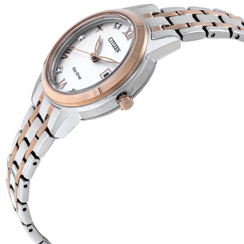 Silver-tone stainless steel case with a two-tone (silver-tone and rose gold-tone) stainless steel bracelet. Fixed rose gold-tone stainless steel bezel. White dial with rose gold-tone hands and Roman numeral-crystal hour markers. Dial Type: Analog. Date display at the 3 o'clock position. Citizen Caliber Eco-Drive J710 eco-drive movement. Scratch resistant mineral crystal. Pull / push crown. Solid case back. Round case shape, case size: 29.4 mm. Deployment with push button release clasp. Water resistant at 30 meters / 100 feet. Functions: date, hour, minute, second, solar-powered. Dress watch style. Watch label: Japan Movt. Citizen Eco-Drive Crystal White Dial Two-Tone Ladies Watch FE1246-85A.
