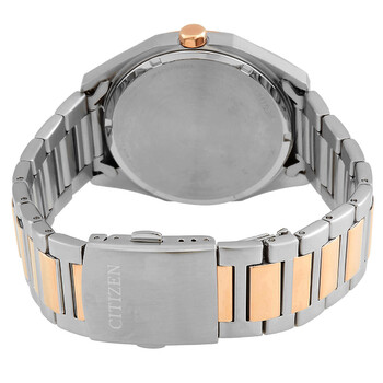 Silver-tone stainless steel case with a two-tone (silver-tone and rose gold-tone) stainless steel bracelet. Fixed rose gold-tone stainless steel bezel. Dark blue dial with rose gold-tone hands and index hour markers. Minute markers around the outer rim. Dial Type: Analog. Date display at the 3 o'clock position. Citizen Caliber Eco-Drive E111 eco-drive movement. Scratch resistant mineral crystal. Solid case back. Round case shape, case size: 41 mm. Fold over clasp with a safety release. Water resistant at 100 meters / 330 feet. Functions: date, hour, minute, second, solar-powered. Dress watch style. Watch label: Japan Movt. Citizen Eco-Drive Dark Blue Dial Men's Watch BM7606-84L.