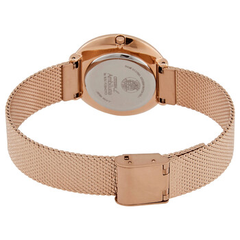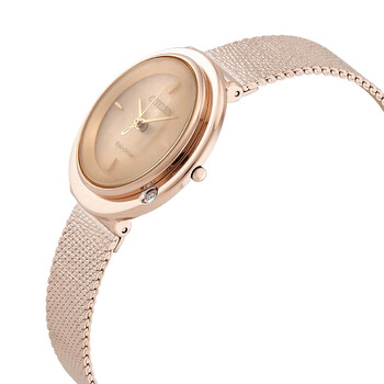 Rose gold-tone stainless steel case with a rose gold-tone stainless steel mesh bracelet. Fixed rose gold-tone bezel set with a single diamond. Light pink gold dial with rose gold-tone hands and index hour markers. Dial Type: Analog. Citizen caliber E031 eco-drive movement. Scratch resistant sapphire crystal. Pull / push crown. Solid case back. Round case shape. Case size: 31 mm. Case thickness: 7.5 mm. Band width: 19 mm. Fold over slip through clasp. Water resistant at 50 meters / 165 feet. Functions: hour, minute, second. Dress watch style. Watch label: Japan Movt. Citizen Eco-Drive Diamond Light Pink Dial Ladies Watch EM0643-84X.