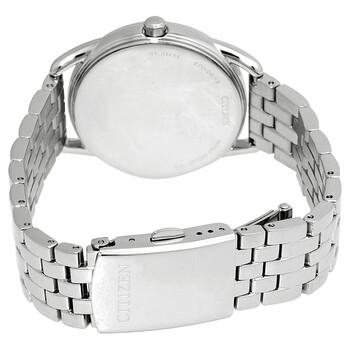 Stainless steel case with a stainless steel bracelet. Fixed stainless steel bezel. Blue dial with silver-tone hands and dot hour markers. Dial Type: Analog. Luminescent hands and markers. Citizen Caliber J830 eco-drive movement. Scratch resistant mineral crystal. Pull / push crown. Solid case back. Round case shape. Case size: 36 mm. Deployment clasp. Water resistant at 30 meters / 100 feet. Functions: hour, minute, second, solar-powered. Dress Classics Series. Dress watch style. Watch label: Japan Movt. Citizen Eco-Drive Dress Classics Blue Dial Ladies Watch FE7090-55L.