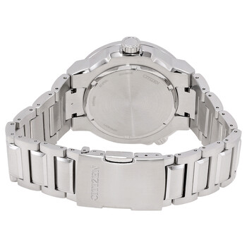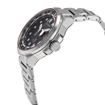 Stainless steel case with a stainless steel bracelet. Fixed stainless steel bezel. Black dial with luminous silver-tone hands and dot hour markers. Minute markers. Arabic numeral minute markers (at 5 minute intervals). 360 degree (compass) markings. 24 hour masrkers around the outer rim. Dial Type: Analog. Luminescent hands and markers. Date display at the 3 o'clock position. Citizen caliber Eco-Drive B877 eco-drive movement. Scratch resistant sapphire crystal. Screw down crown. Solid case back. Round case shape. Case size: 44 mm. Band width: 26 mm. Fold over clasp with a safety release. Water resistant at 200 meters / 660 feet. Functions: date, GMT, second time zone, hour, minute, second, solar-powered. Endeavor Series. Dress watch style. Watch label: Japan Movt. Citizen Eco-Drive Endeavor Black Dial Men's Watch BJ7140-53E.