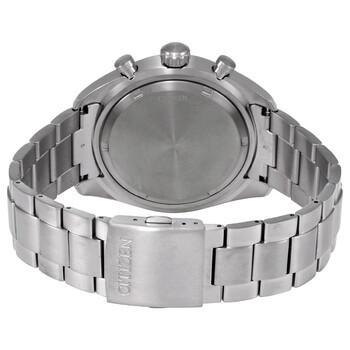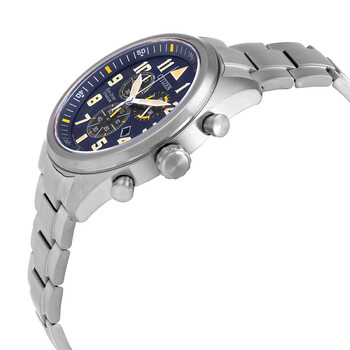 Grey super titanium case and bracelet. Fixed grey super titanium bezel. Blue dial with luminous silver-tone hands and Arabic numeral hour markers. Arabic numeral minute markers (at 10 minute intervals). Markers around the outer rim. Dial Type: Analog. Luminescent hands and markers. Date display at the 4 o'clock position. Chronograph - three sub-dials displaying: 60 minute, 60 second and 24 hour. Citizen caliber Eco-Drive H500 eco-drive movement. Scratch resistant sapphire crystal. Solid case back. Round case shape. Case size: 44 mm. Band width: 22 mm. Fold over clasp. Water resistant at 100 meters / 330 feet. Functions: chronograph, date, GMT, second time zone, hour, minute, second, solar-powered. Garrison Series. Casual watch style. Watch label: Japan Movt. Citizen Eco-Drive Garrison Chronograph Blue Dial Men's Watch AT2480-57L.