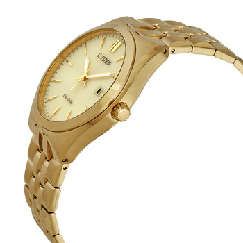 Yellow gold-tone stainless steel case and bracelet. Fixed yellow gold-tone stainless steel bezel. Gold-tone dial with luminous yellow gold-tone hands and index hour markers. Minute markers around the outer rim. Dial Type: Analog. Luminescent hands and markers. Date display at the 3 o'clock position. Citizen caliber Eco-Drive E111 eco-drive movement. Scratch resistant mineral crystal. Solid case back. Round case shape. Case size: 40 mm. Case thickness: 10 mm. Band width: 20 mm. Fold over clasp with a push button release. Water resistant at 100 meters / 330 feet. Functions: date, hour, minute, second, solar-powered. Eco-drive Series. Casual watch style. Watch label: Japan Movt. Citizen Eco-Drive Gold Dial Men's Watch BM7332-61P.