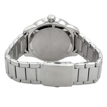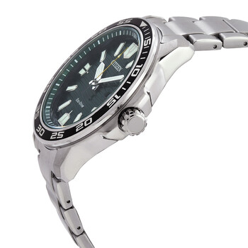 Silver-tone stainless steel case and bracelet. Black stainless steel bezel. Green dial with silver-tone hands and index hour markers. Minute markers around the outer rim. Dial Type: Analog. Luminescent hands and markers. Date display at the 3 o'clock position. Citizen Caliber Eco-Drive J810 eco-drive movement. Scratch resistant mineral crystal. Solid case back. Round case shape, case size: 45 mm. Deployment with push button release clasp. Water resistant at 100 meters / 330 feet. Functions: date, hour, minute, second, solar-powered. Casual watch style. Watch label: Japan Movt. Citizen Eco-Drive Green Dial Men's Watch EW1701-56X.