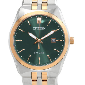 Silver-tone stainless steel case with a two-tone (silver-tone and gold-tone) stainless steel bracelet. Fixed gold-tone stainless steel bezel. Green dial with gold-tone hands and index hour markers. Minute markers around the outer rim. Dial Type: Analog. Date display at the 3 o'clock position. Citizen Caliber Eco-Drive E111 eco-drive movement. Scratch resistant mineral crystal. Solid case back. Round case shape, case size: 40 mm. Fold over clasp with a safety release. Water resistant at 100 meters / 330 feet. Functions: date, hour, minute, second, solar-powered. Dress watch style. Watch label: Japan Movt. Citizen Eco-Drive Green Dial Two-Tone Men's Watch BM7339-89X.