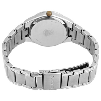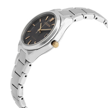 Stainless steel case with a stainless steel bracelet. Fixed stainless steel bezel. Grey dial with luminous gold-tone hands and index hour markers. Minute markers around the outer rim. Dial Type: Analog. Luminescent hands and markers. Date display at the 3 o'clock position. Citizen caliber Eco-Drive E011 eco-drive movement. Scratch resistant mineral crystal. Pull / push crown. Solid case back. Round case shape. Case size: 28 mm. Case thickness: 9 mm. Fold over clasp with a push button release. Water resistant at 100 meters / 330 feet. Functions: date, hour, minute, second, solar-powered. Casual watch style. Watch label: Japan Movt. Citizen Eco-Drive Grey Dial Ladies Watch EW1970-55H.