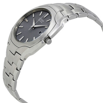 Stainless steel case with a stainless steel bracelet. Fixed stainless steel bezel. Grey dial with luminous silver-tone hands and index hour markers. Minute markers around the outer rim. Dial Type: Analog. Date display at the 3 o'clock position. Eco-drive movement. Scratch resistant mineral crystal. Pull / push crown. Solid case back. Case size: 38 mm. Case thickness: 8 mm. Round case shape. Band width: 24 mm. Fold over clasp with a push button release. Water resistant at 30 meters / 100 feet. Functions: date, hour, minute, second. Additional Info: eco-drive movement generates ongoing electrical energy. this allows the watch to charge outdoors or in artificial light. you'll never have to change a. Casual watch style. Watch label: Made in Japan. Item Variations: BM6010 55A, BM6010.55A, BM601055A. Citizen Eco-Drive Grey Dial Men's Watch BM6010-55A.
