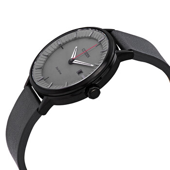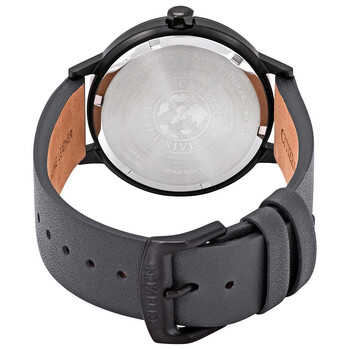 Black ion-plated stainless steel case with a grey leather strap. Fixed black ion-plated stainless steel bezel. Grey dial with silver-tone hands and index hour markers. Minute markers around the outer rim. Dial Type: Analog. Luminescent hands and markers. Date display at the 3 o'clock position. Citizen Caliber Eco-Drive E111 eco-drive movement. Scratch resistant sapphire crystal. Pull / push crown. Solid case back. Round case shape, case size: 41.5 mm, case thickness: 9.3 mm. Band width: 18 mm. Buckle clasp. Water resistant at 100 meters / 330 feet. Functions: date, hour, minute, second, solar-powered. Casual watch style. Watch label: Japan Movt. Citizen Eco-Drive Grey Dial Men's Watch BM7375-18H.