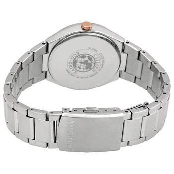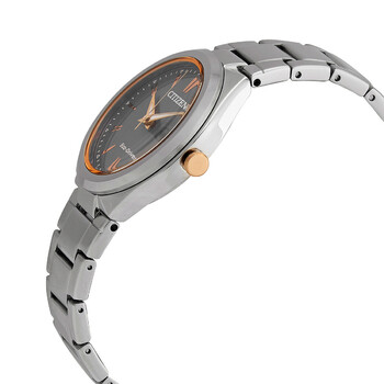 Stainless steel case with a stainless steel bracelet. Fixed stainless steel bezel. Grey dial with luminous rose gold-tone hands and index hour markers. Minute markers around the outer rim. Dial Type: Analog. Luminescent hands. Date display at the 3 o'clock position. Calibre J810 eco-drive movement. Scratch resistant mineral crystal. Pull / push crown. Solid case back. Round case shape. Case size: 34.8 mm. Case thickness: 8.7 mm. Fold over clasp with a safety release. Water resistant at 50 meters / 165 feet. Functions: date, hour, minute, second. Eco-drive Series. Dress watch style. Citizen Eco-Drive Grey Dial Stainless Steel Ladies Watch FE6026-50H.
