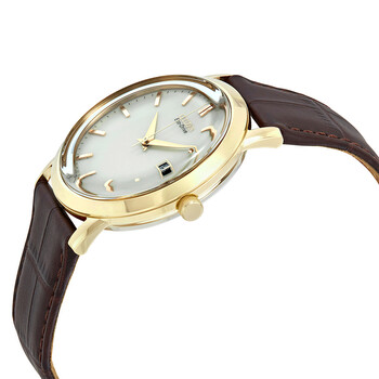 Gold-tone stainless steel case with a brown leather strap. Fixed rose gold-tone bezel. Ivory dial with index hour markers. Minute markers around the outer rim. Dial Type: Analog. Date display at the 3 o'clock position. Citizen caliber Eco-Drive E111 eco-drive movement. Scratch resistant mineral crystal. Pull / push crown. Solid case back. Round case shape. Case size: 40 mm. Case thickness: 10 mm. Band width: 22 mm. Band length: 7.5 inches. Tang clasp. Water resistant at 30 meters / 100 feet. Functions: date, hour, minute, second. Casual watch style. Watch label: Japan Movt. Item Variations: BM7193 07B, BM7193-07B, BM7193/07B, BM719307B. Citizen Eco-Drive Ivory Dial Brown Leather Men's Watch BM7193-07B.