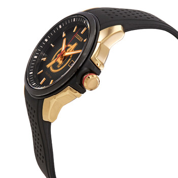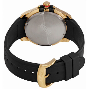 Gold-tone stainless steel case with a black silicone strap. Fixed black ABS bezel. Black (Avengers) dial with luminous gold-tone hands and index hour markers. Minute markers around the outer rim. Dial Type: Analog. Luminescent hands and markers. Date display at the 3 o'clock position. Citizen caliber Eco-Drive J810 eco-drive movement. Scratch resistant mineral crystal. Solid case back. Round case shape. Case size: 45 mm. Case thickness: 11.2 mm. Band width: 20 mm. Fold over clasp with a safety release. Water resistant at 100 meters / 330 feet. Functions: date, hour, minute, second, solar-powered. Marvel Avengers Series. Casual watch style. Watch label: Japan Movt. Citizen Eco-Drive Marvel Avengers Black Dial Men's Watch AW1155-03W.