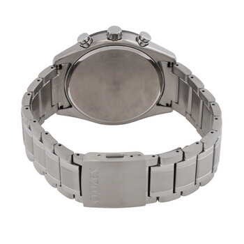 Silver-tone titanium case and bracelet. Fixed black titanium bezel. Black dial with silver-tone hands and index hour markers. Minute markers around the outer rim. Dial Type: Analog. Luminescent hands and markers. Date display at the 4 o'clock position. Eco-drive movement. Scratch resistant sapphire crystal. Solid case back. Round case shape, case size: 43 mm, case thickness: 10.9 mm. Fold over clasp with a safety release. Water resistant at 100 meters / 330 feet. Functions: date, day, hour, minute, second, moon phase, worldtimer 26 zones. Sport watch style. Watch label: Japan Movt. Citizen Eco-Drive Moon Phase Black Dial Men's Watch BY1018-80E.