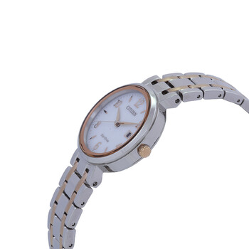 Silver-tone stainless steel case with a two-tone (silver-tone and rose gold-tone) stainless steel bracelet. Fixed silver-tone stainless steel bezel. Mother of pearl dial with rose gold-tone hands and Arabic numeral hour markers. Minute markers around the outer rim. Dial Type: Analog. Citizen Caliber Eco-Drive E011 eco-drive movement. Scratch resistant mineral crystal. Pull / push crown. Solid case back. Round case shape, case size: 28 mm. Deployment with push button release clasp. Water resistant at 50 meters / 165 feet. Functions: date, hour, minute, second, solar-powered. Casual watch style. Watch label: Japan Movt. Citizen Eco-Drive Mother of Pearl Dial Two-Tone Ladies Watch EW2696-84A.