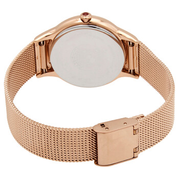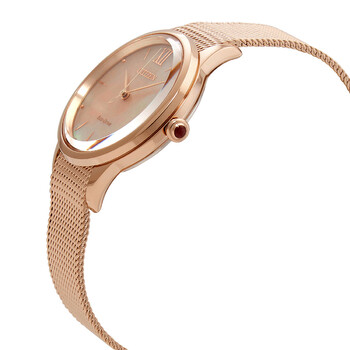 Rose gold plating stainless steel case with a rose gold plating stainless steel mesh bracelet. Fixed rose gold-tone stainless steel bezel. Perlmutt/motherofpearl dial with rose gold-tone hands and index hour markers. Roman numeral appears at the 12 o'clock position. Dial Type: Analog. Citizen Caliber E031 eco-drive movement with a 180-day power reserve. Scratch resistant sapphire crystal. Solid case back. Round case shape, case size: 32.5mm, case thickness: 7.6mm. Fold over slip through clasp. Water resistant at 50 meters / 165 feet. Functions: hour, minute, second. Eco-drive Series. Casual watch style. Watch label: Japan Movt. Citizen Eco-Drive Mother-of-Pearl Dial Ladies Watch EM0813-86Y.