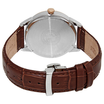 Stainless steel case with a brown leather strap. Fixed rose gold-tone bezel. Navy dial with rose gold-tone hands and index hour markers. Minute markers around the outer rim. Dial Type: Analog. Date display at the 6 o'clock position. Day of the week display below the 12 o'clock position. Citizen caliber J800 eco-drive movement. Scratch resistant sapphire crystal. Pull / push crown. Solid case back. Round case shape. Case size: 40 mm. Tang clasp. Water resistant at 100 meters / 330 feet. Functions: date, day, hour, minute, second. Casual watch style. Citizen Eco-Drive Navy Dial Men's Watch AW0096-06L.