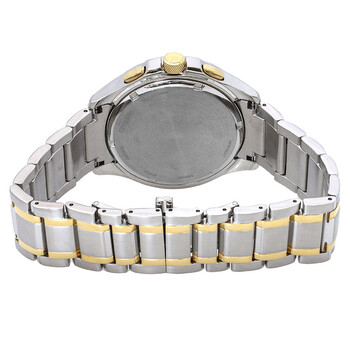 Silver-tone stainless steel case with a two-tone (silver-tone and gold-tone) stainless steel bracelet. Fixed silver-tone stainless steel bezel. Black dial with gold-tone hands and index hour markers. Minute markers around the outer rim. Dial Type: Analog. Luminescent hands and markers. Date display at the 4 o'clock position. Three sub-dials displaying: function display, 24 hour (dual time) and day of the week. Citizen Caliber Eco-Drive E870 eco-drive movement. Scratch resistant sapphire crystal. Solid case back. Round case shape, case size: 43.2 mm. Folding clasp. Water resistant at 100 meters / 330 feet. Functions: perpetual calendar, leap year, alarm, month, date, day, GMT, second time zone, hour, minute, second, solar-powered. Sport watch style. Watch label: Japan Movt. Citizen Eco-Drive Perpetual Alarm Black Dial Men's Watch BL8164-57E.