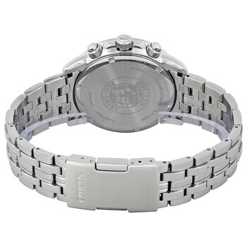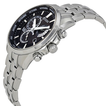 Stainless steel case with a stainless steel bracelet. Fixed stainless steel bezel. Black dial with luminous silver-tone hands and index hour markers. Minute markers. Months of the year around the outer rim. Dial Type: Analog. Luminescent hands and markers. Date display at the 4 o'clock position. Day of the week display at the 2 o'clock position. Two sub-dials displaying: 24 hour and functions. Citizen caliber Eco-Drive E870 eco-drive movement. Scratch resistant sapphire crystal. Pull / push crown. Solid case back. Case size: 42 mm. Case thickness: 12 mm. Round case shape. Band width: 22 mm. Fold over clasp with a safety release. Water resistant at 100 meters / 330 feet. Functions: perpetual calendar, leap year, alarm, month, date, day, GMT, second time zone, hour, minute, second. Sport watch style. Watch label: Japan Movt. Citizen Eco-Drive Perpetual Black Dial Men's Watch BL8140-55E