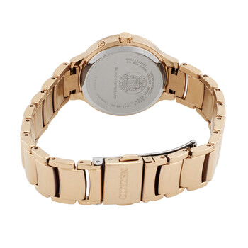 Rose gold IP stainless steel case and bracelet. Fixed rose gold IP stainless steel bezel. Mother of pearl dial with rose gold-tone hands and index-Arabic numeral hour markers. Arabic numeral marks the 12 o'clock position. Minute markers around the outer rim. Dial Type: Analog. Date display at the 3 o'clock position. Citizen Caliber H246 eco-drive movement. Scratch resistant sapphire crystal. Pull / push crown. Solid case back. Round case shape, case size: 30 mm, case thickness: 8.5 mm. Fold over clasp with a safety release. Water resistant at 50 meters / 165 feet. Functions: date, hour, minute, second, solar-powered, perpetual calendar, global radio-controlled, world time. Dress watch style. Watch label: Japan Movt. Citizen Eco-Drive Perpetual World Time Mother of Pearl Dial Ladies Watch EC1173-87Y.
