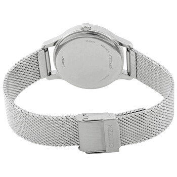 Silver-tone stainless steel case with a silver-tone stainless steel mesh bracelet. Fixed silver-tone stainless steel bezel. Pink dial with silver-tone hands and index-Roman numeral hour markers. Roman numeral marks the 6 and 12 o'clock positions. Minute markers around the outer rim. Dial Type: Analog. Citizen Caliber Eco-Drive E031 eco-drive movement. Scratch resistant mineral crystal. Pull / push crown. Solid case back. Round case shape, case size: 30.5 mm, case thickness: 8.2 mm. Water resistant at 50 meters / 165 feet. Functions: hour, minute, second, solar-powered. Dress watch style. Watch label: Japan Movt. Citizen Eco-Drive Pink Dial Ladies Watch EM0899-81X.