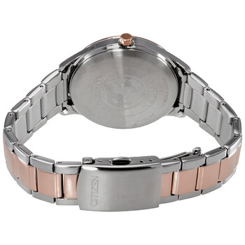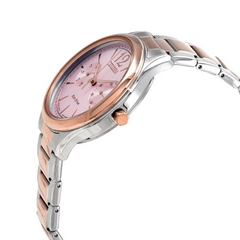 Stainless steel case with a two-tone (rose gold-tone and silver-tone) stainless steel bracelet. Fixed stainless steel bezel. Pink dial with luminous rose gold-tone hands and index hour markers. An Arabic numeral appears at the 12 o'clock position. Minute markers around the outer rim. Dial Type: Analog. Luminescent hands. Two sub-dials displaying: date and day of the week. Eco-drive movement. Scratch resistant mineral crystal. Pull / push crown. Solid case back. Round case shape. Case size: 36 mm. Case thickness: 10 mm. Band width: 15 mm. Fold over clasp with a safety release. Water resistant at 50 meters / 165 feet. Functions: date, day, hour, minute, second. Eco-drive Series. Dress watch style. Watch label: Japan Movt. Citizen Eco-Drive Pink Dial Two-tone Ladies Watch FD4026-81X.