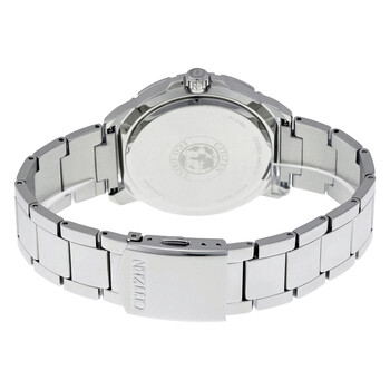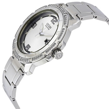 Stainless steel case with a stainless steel bracelet. Fixed stainless steel bezel set with Swarovski crystals. Silver dial with luminous silver-tone hands and crystal hour markers. Marabic numerals mark the 3, 6, 9 and 12 o'clock positions. Minute markers. Dial Type: Analog. Luminescent hands. Date display at the 3 o'clock position. Quartz movement. Scratch resistant mineral crystal. Pull / push crown. Solid case back. Case size: 44 mm. Case thickness: 11 mm. Round case shape. Band width: 22 mm. Fold over clasp with a safety release. Water resistant at 30 meters / 100 feet. Functions: date, hour, minute, second. Casual watch style. Citizen Eco-Drive POV Unisex Watch AW1340-52A.