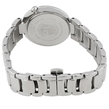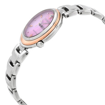 Silver-tone stainless steel case and bracelet. Fixed rose gold-tone stainless steel bezel. Purple dial with silver-tone hands and index hour markers. Dial Type: Analog. Citizen Caliber Eco-Drive E031 eco-drive movement. Scratch resistant sapphire crystal. Pull / push crown. Solid case back. Round case shape, case size: 30.2 mm, case thickness: 7.3 mm. Fold over clasp with a safety release. Water resistant at 50 meters / 165 feet. Functions: hour, minute, second, solar-powered. Dress watch style. Watch label: Japan Movt. Citizen Eco-Drive Purple Dial Ladies Watch EM0588-81X.