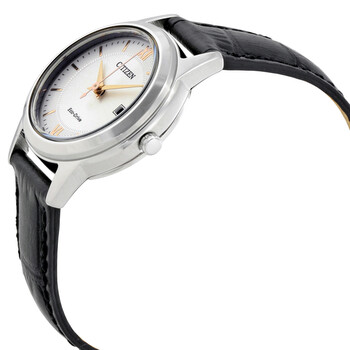 Stainless steel case with a black (calfskin) leather strap. Fixed stainless steel bezel. Silver dial with rose gold-tone hands and index hour markers. Roman numerasl mark the 6 and 12 o'clock positions. Minute markers around the outer rim. Dial Type: Analog. Date display at the 3 o'clock position. Eco-Drive J710 eco-drive movement. Scratch resistant mineral crystal. Pull / push crown. Solid case back. Case size: 29 mm. Case thickness: 9 mm. Round case shape. Band width: 15 mm. Band length: 7 inches. Tang clasp. Water resistant at 30 meters / 100 feet. Functions: date, hour, minute, second. Additional Info: splash resistant. Casual watch style. Watch label: Japan Movt. Item Variations: FE1086 04A, FE1086.04A, FE108604A. Citizen Ladies Straps Eco-Drive Silver Dial Ladies Watch FE1086-04A.